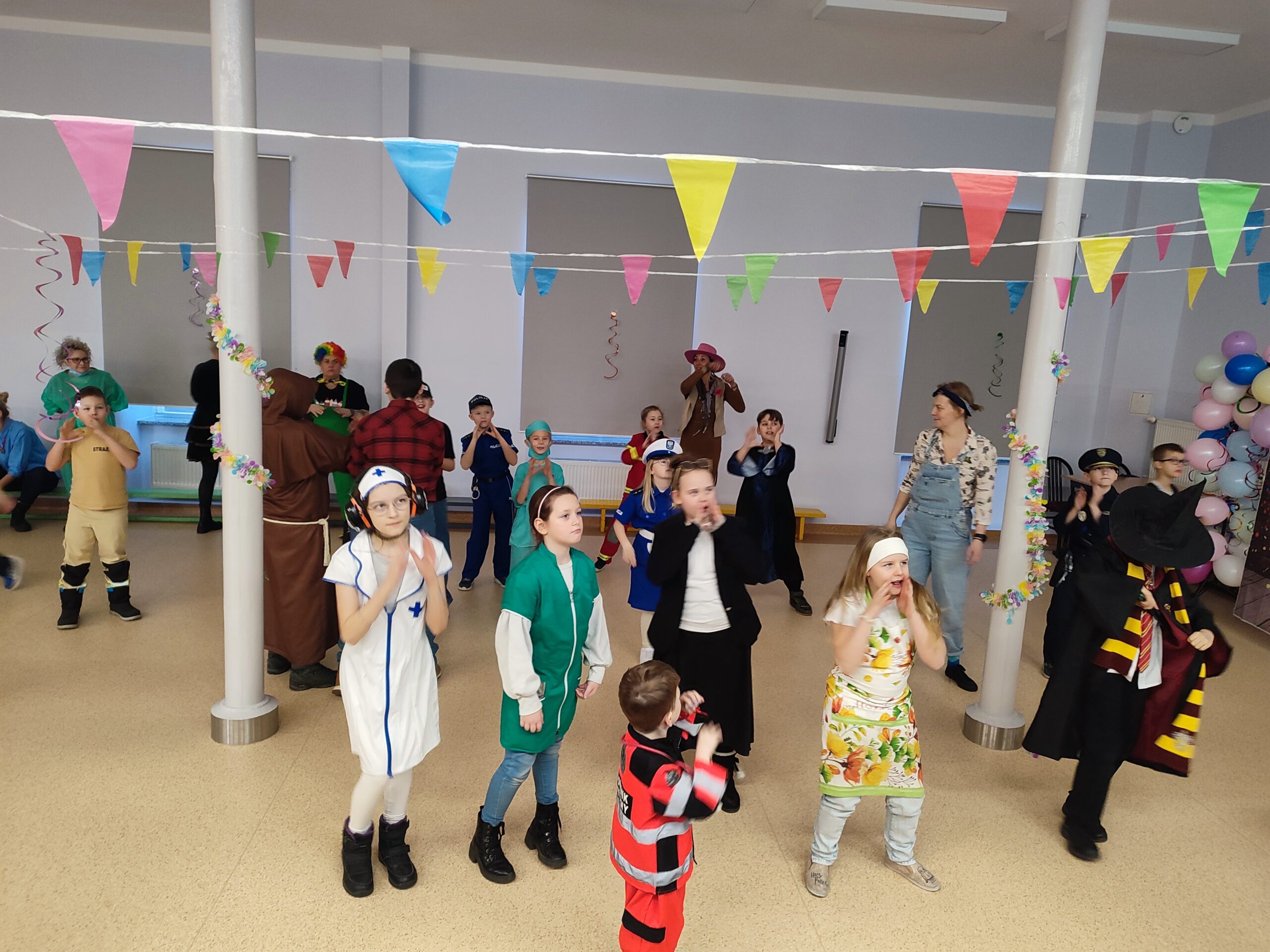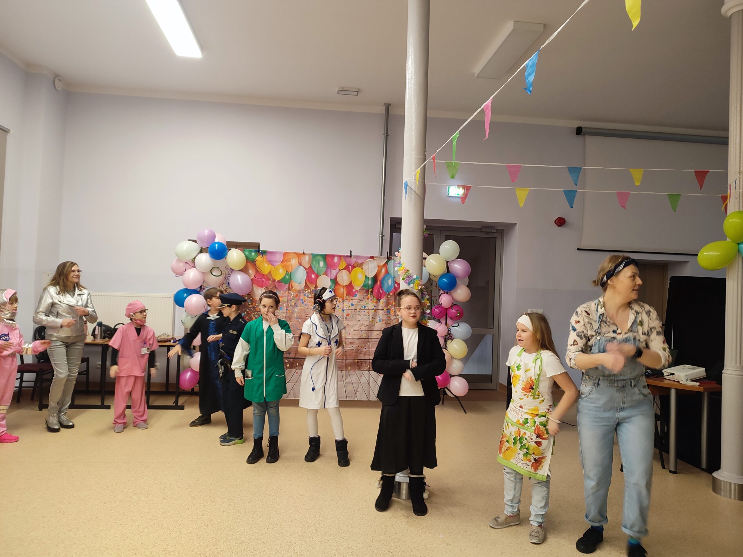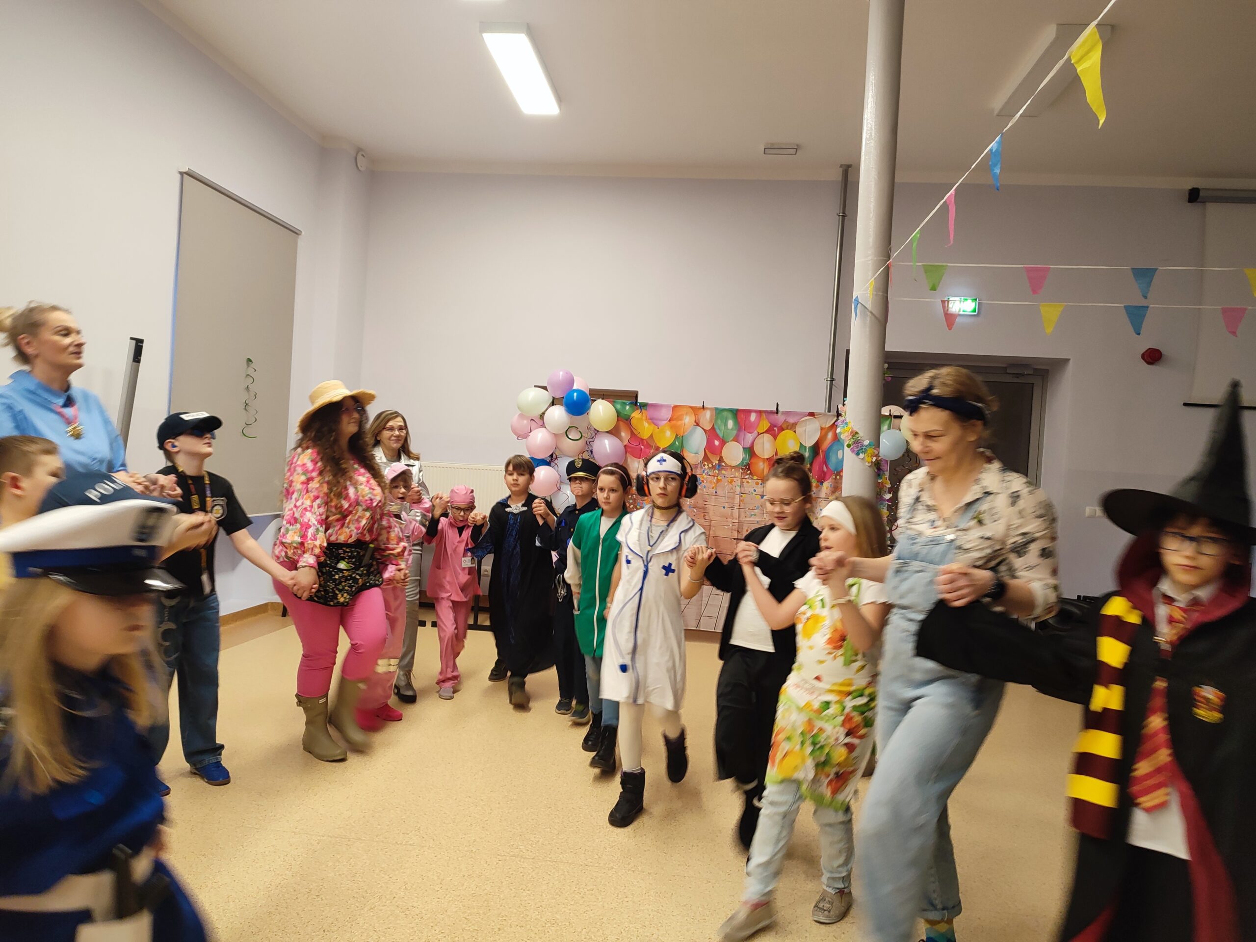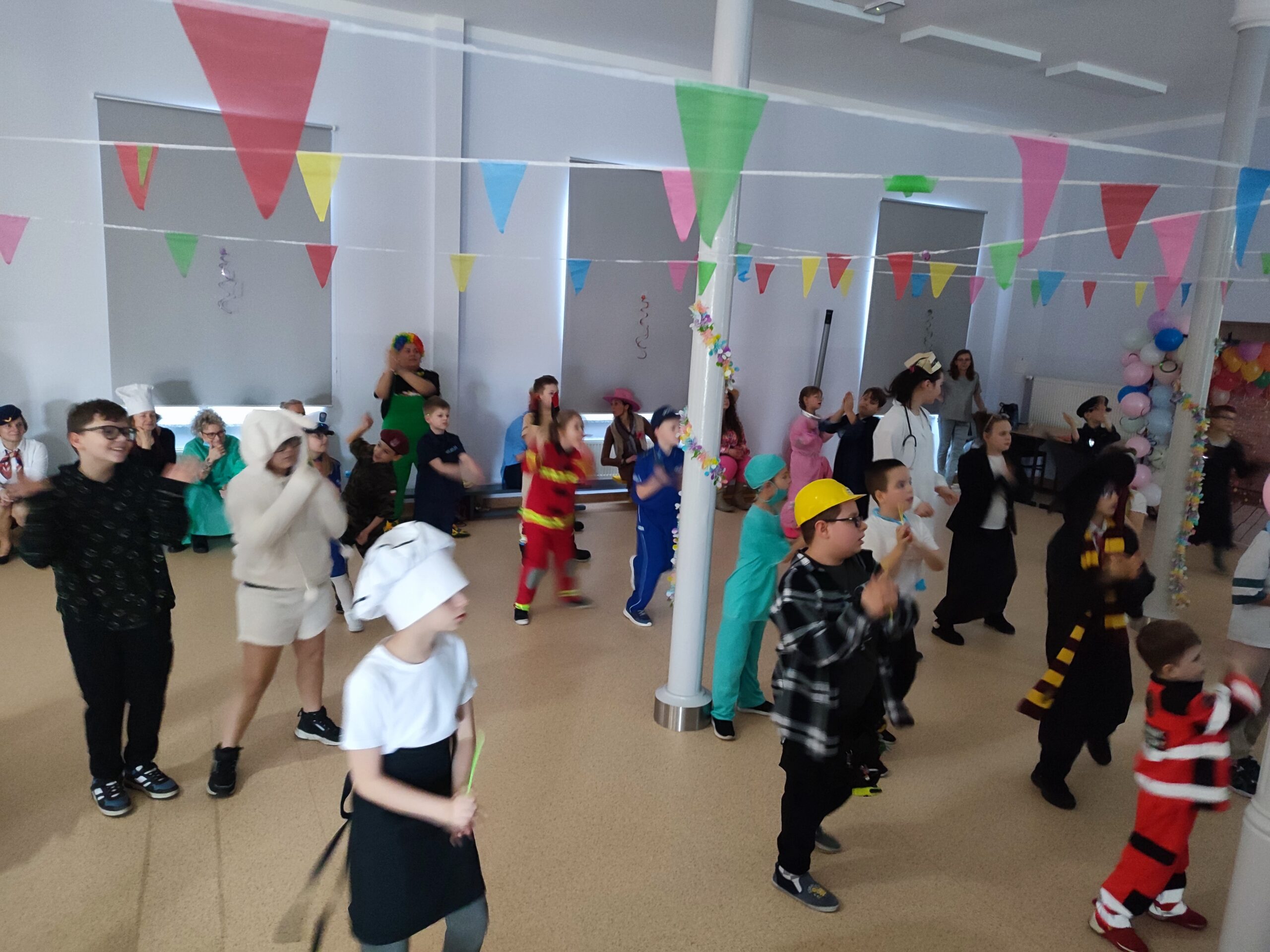 Karnawał to czas radości i wspólnej zabawy – a tegoroczny Bal karnawałowy w naszej szkole na długo pozostanie w pamięci uczniów. Aula zamieniła się w kolorową salę balową pełną balonów, serpentyn i błyszczących dekoracji, tworząc wyjątkową atmosferę. Bal uczniów z klas 1–4 odbył się pod hasłem różnych zawodów. Uczniowie zachwycali pomysłowymi strojami, na parkiecie pojawili się m.in. policjanci, strażacy i pielęgniarki. Do zabawy dołączyły także wychowawczynie w kreatywnych przebraniach. Nie zabrakło tańców, konkursów i tradycyjnego tanecznego pociągu. Na parkiecie bawili się także uczniowie klas 5–8 tańcząc do najpopularniejszych przebojów i biorąc udział w integracyjnych zabawach. Bal był doskonałą okazją do wspólnej radości i integracji całej społeczności szkolnej.