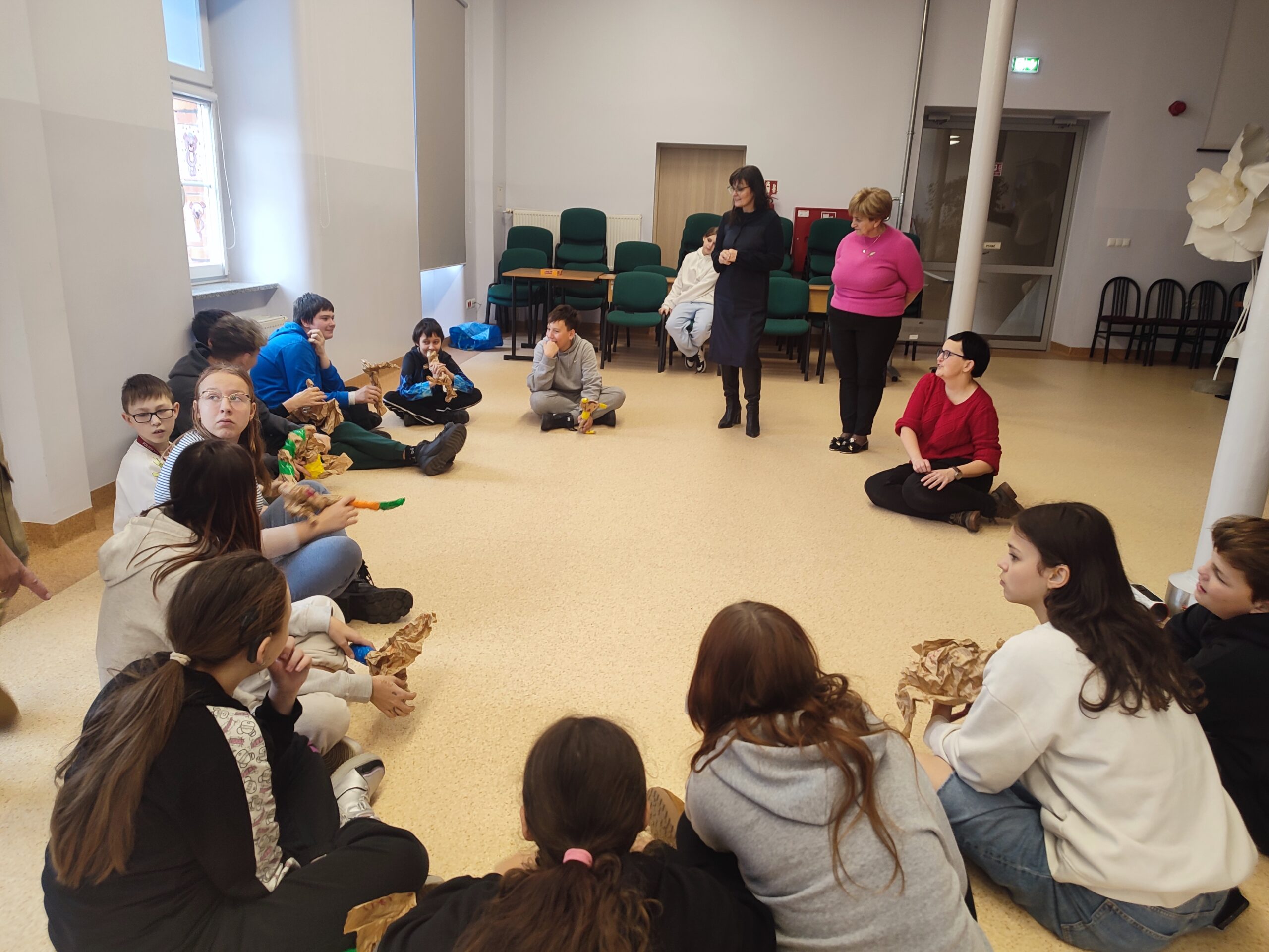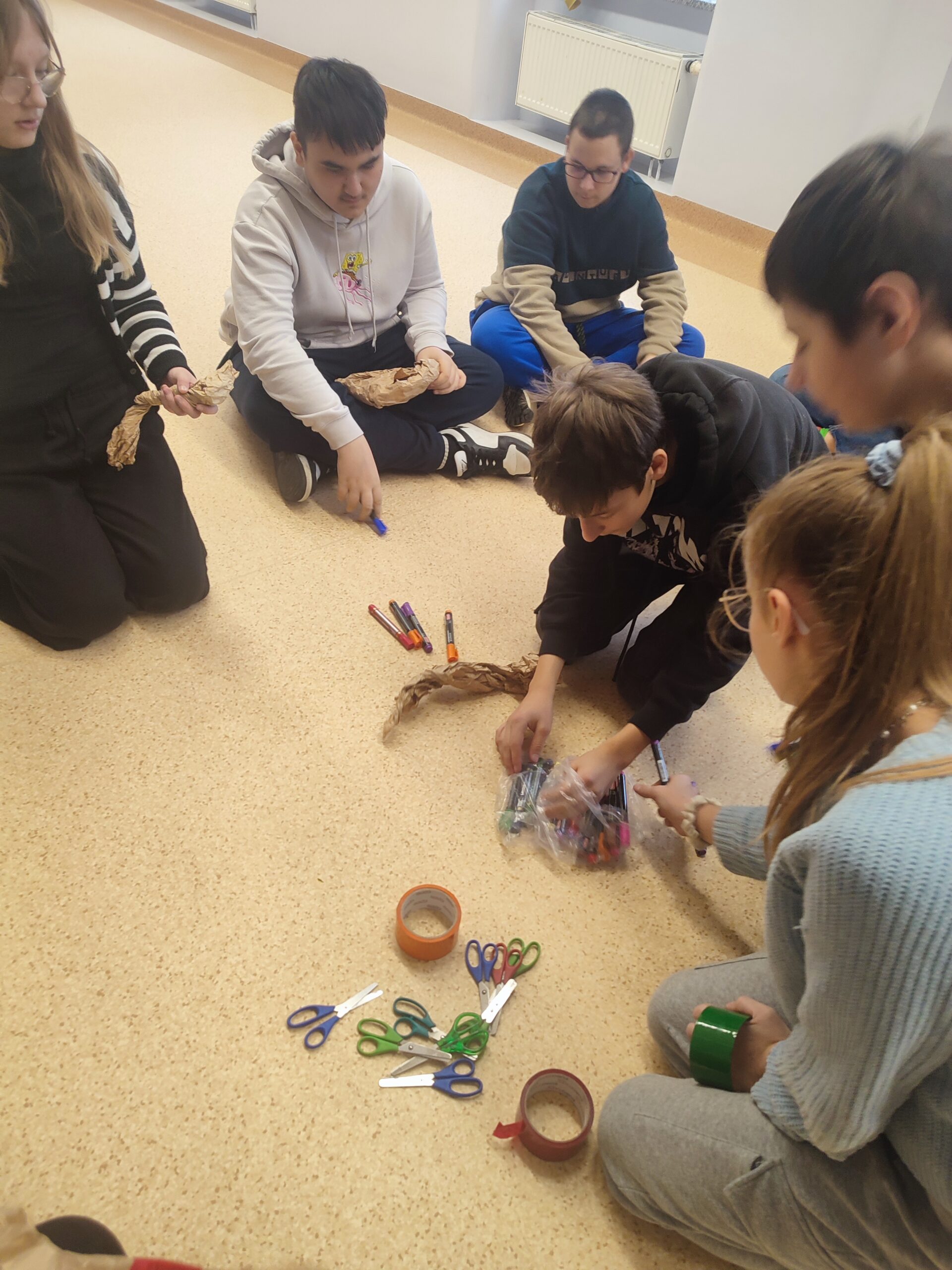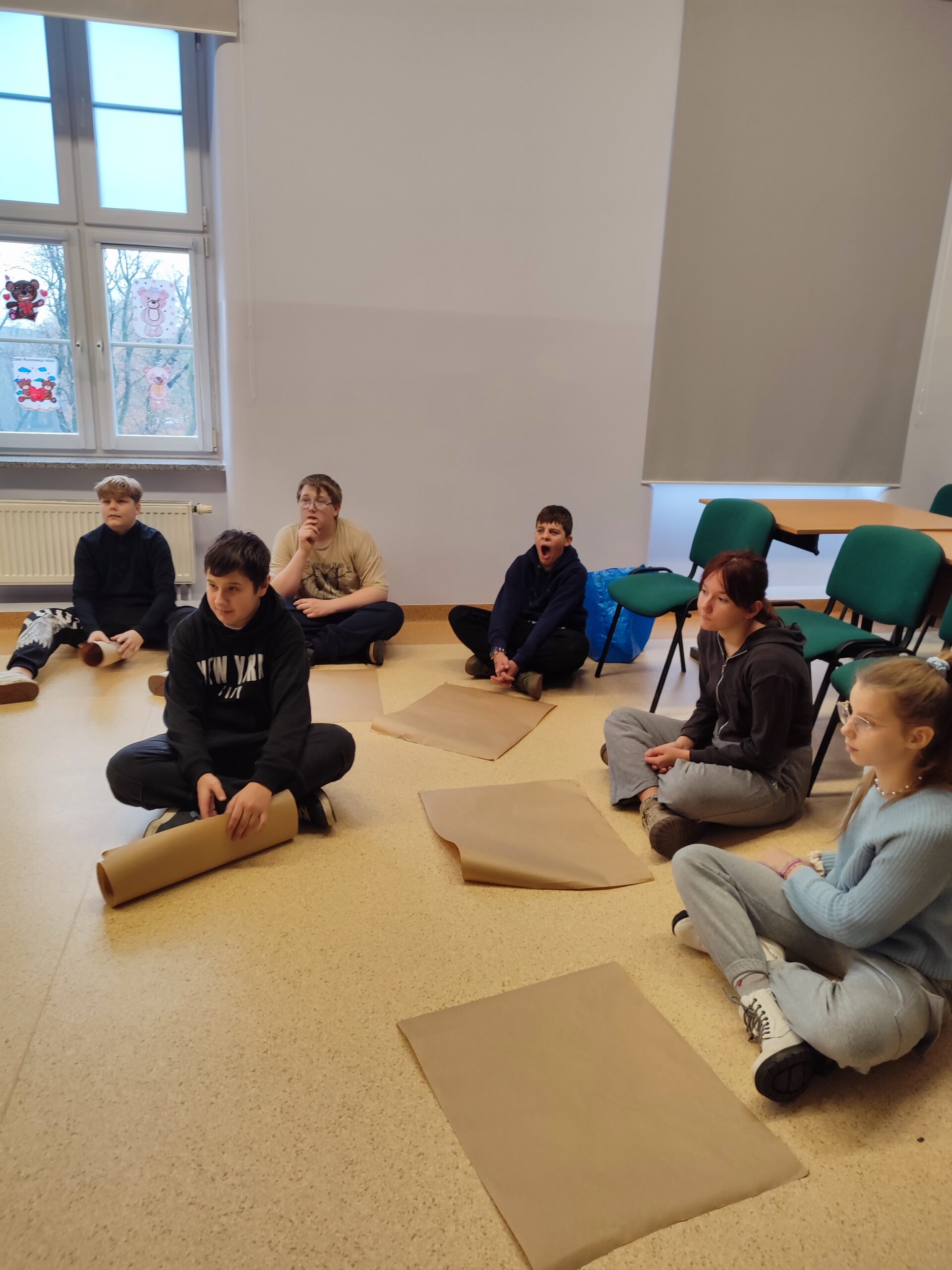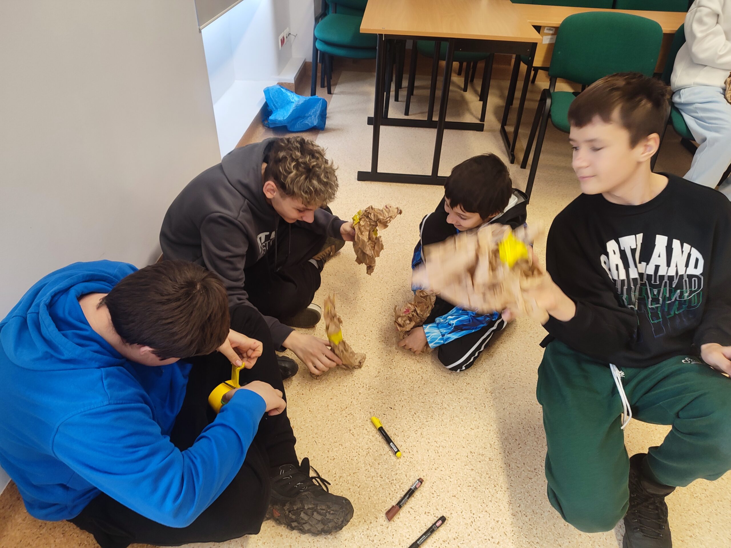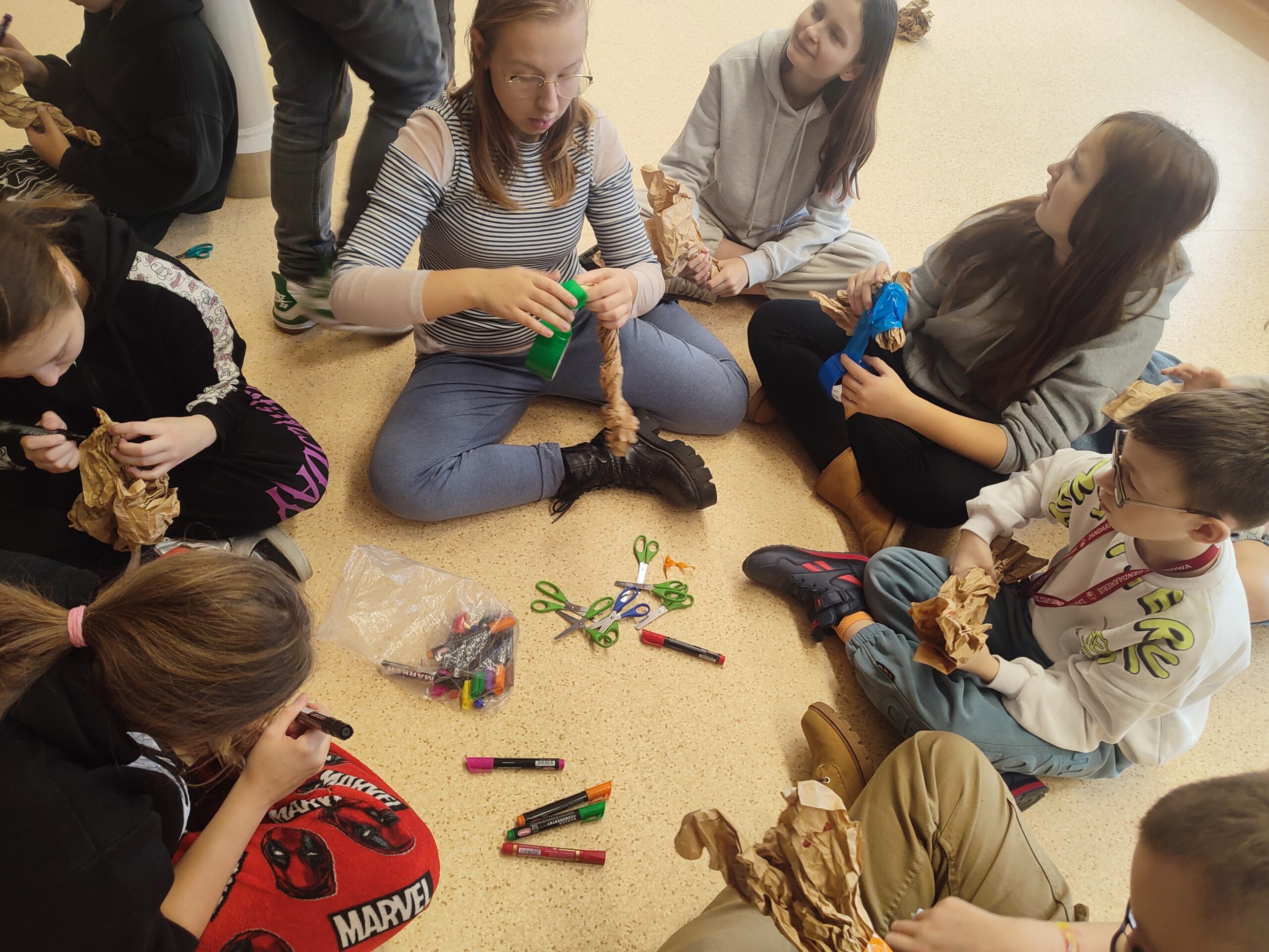 Każdy uczestnik otrzymał arkusz szarego papieru, który mógł dowolnie zgniatać, formować i modelować. Zadanie polegało na stworzeniu własnej „lalki” – postaci, która dzięki kreatywnemu podejściu miała zyskać charakter i osobowość. Po uformowaniu kształtu dorysowywali swojej postaci oczy, nadawali jej imię oraz wymyślali krótką historię, w której ich bohater odgrywał główną rolę. Zwieńczeniem pracy była mini-prezentacja sceniczna. Uczniowie animowali swoje papierowe postacie, wykorzystując wyobraźnię, ruch i głos, tworząc krótkie, często zabawne i bardzo oryginalne etiudy.