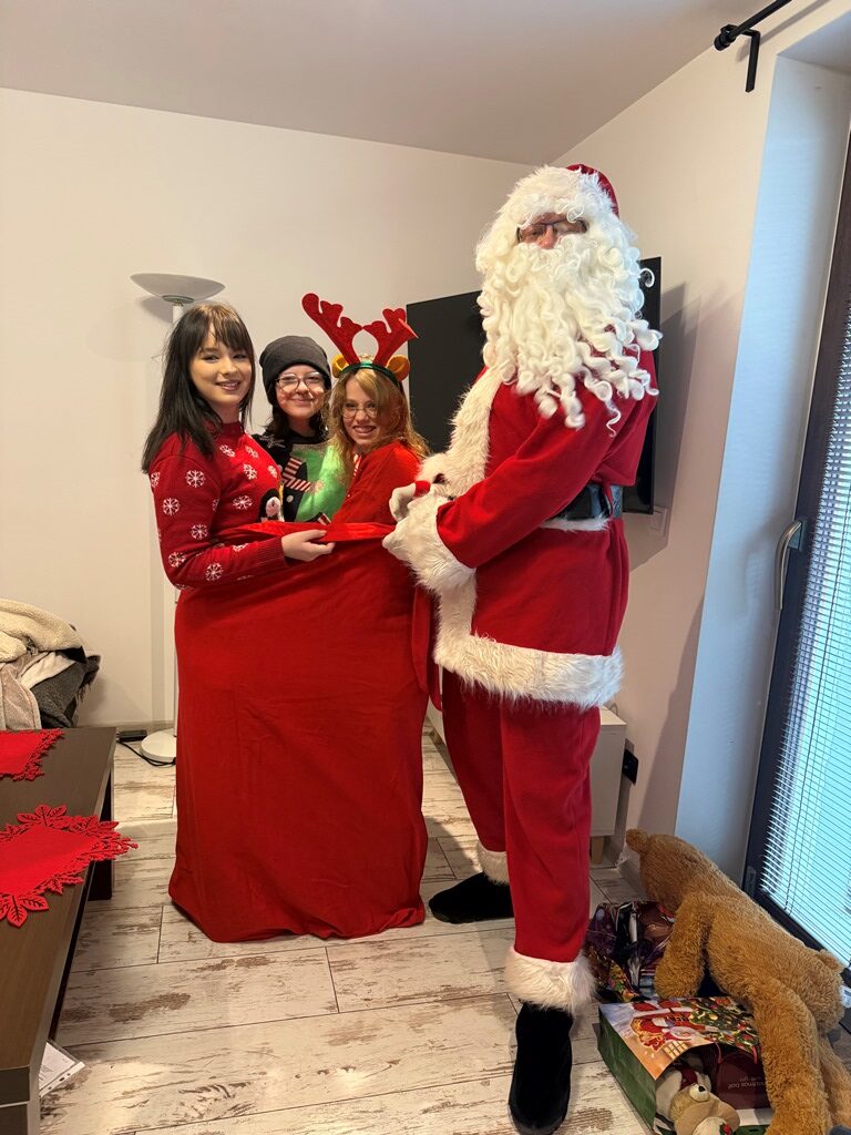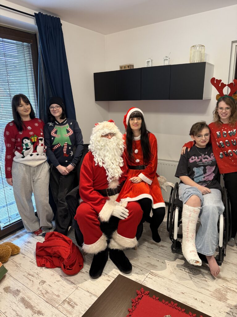 W dniu 9 grudnia 2025r. Mikołaj wraz z Panią Mikołajową oraz przedstawicielami Rady Młodzieży odwiedzili chorą uczennicę naszej szkoły, aby przekazać jej świąteczne upominki oraz okazać wsparcie w trudnym czasie. Wizyta miała na celu nie tylko wręczenie prezentów, lecz także budowanie postaw empatii, życzliwości i wrażliwości wśród młodzieży zaangażowanej w działania samorządowe.