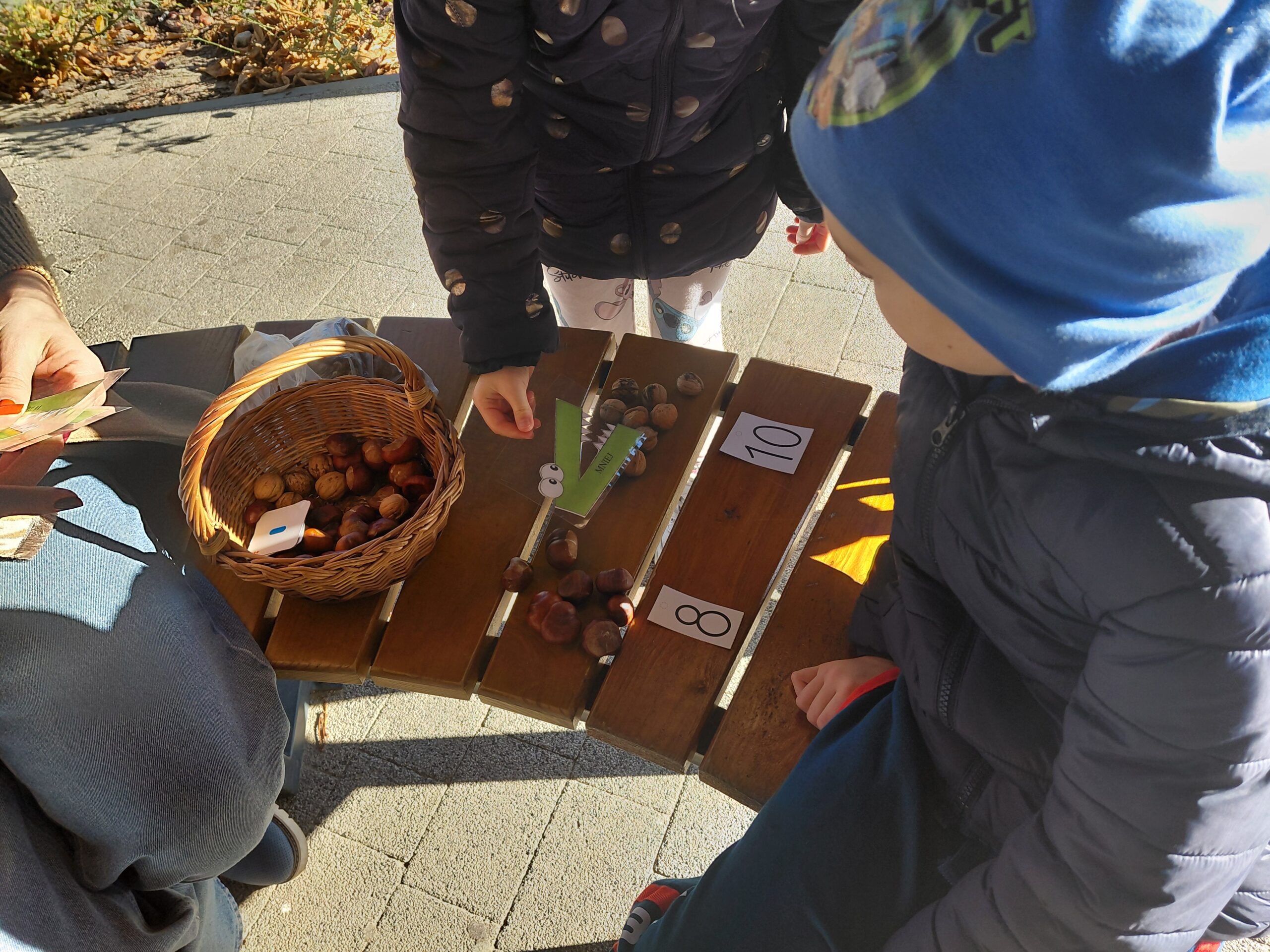 Naszą podróż zaczęliśmy jesienią, tropiąc matematykę ukrytą w naturze. Sale lekcyjne wypełniły się kasztanami, orzechami i kolorowymi liśćmi, które stały się najlepszymi pomocami dydaktycznymi. Dzieci z wielkim zaangażowaniem segregowały dary jesieni, porównywały ich ilości oraz trenowały dodawanie i odejmowanie na konkretnych przykładach. Nie zabrakło też ćwiczeń z symetrii – uczniowie z niezwykłą precyzją dorysowywali brakujące połówki liści lub dopasowywali do siebie zalaminowane elementy, odkrywając, że przyroda jest doskonałym matematykiem.