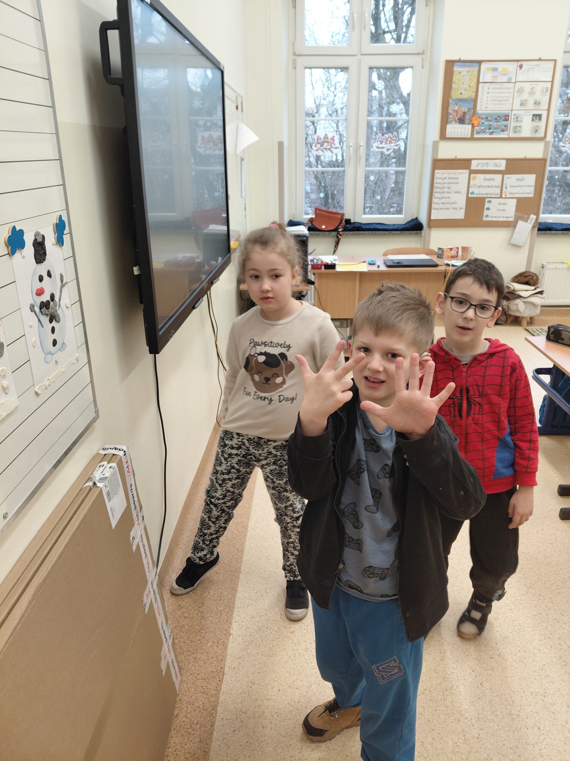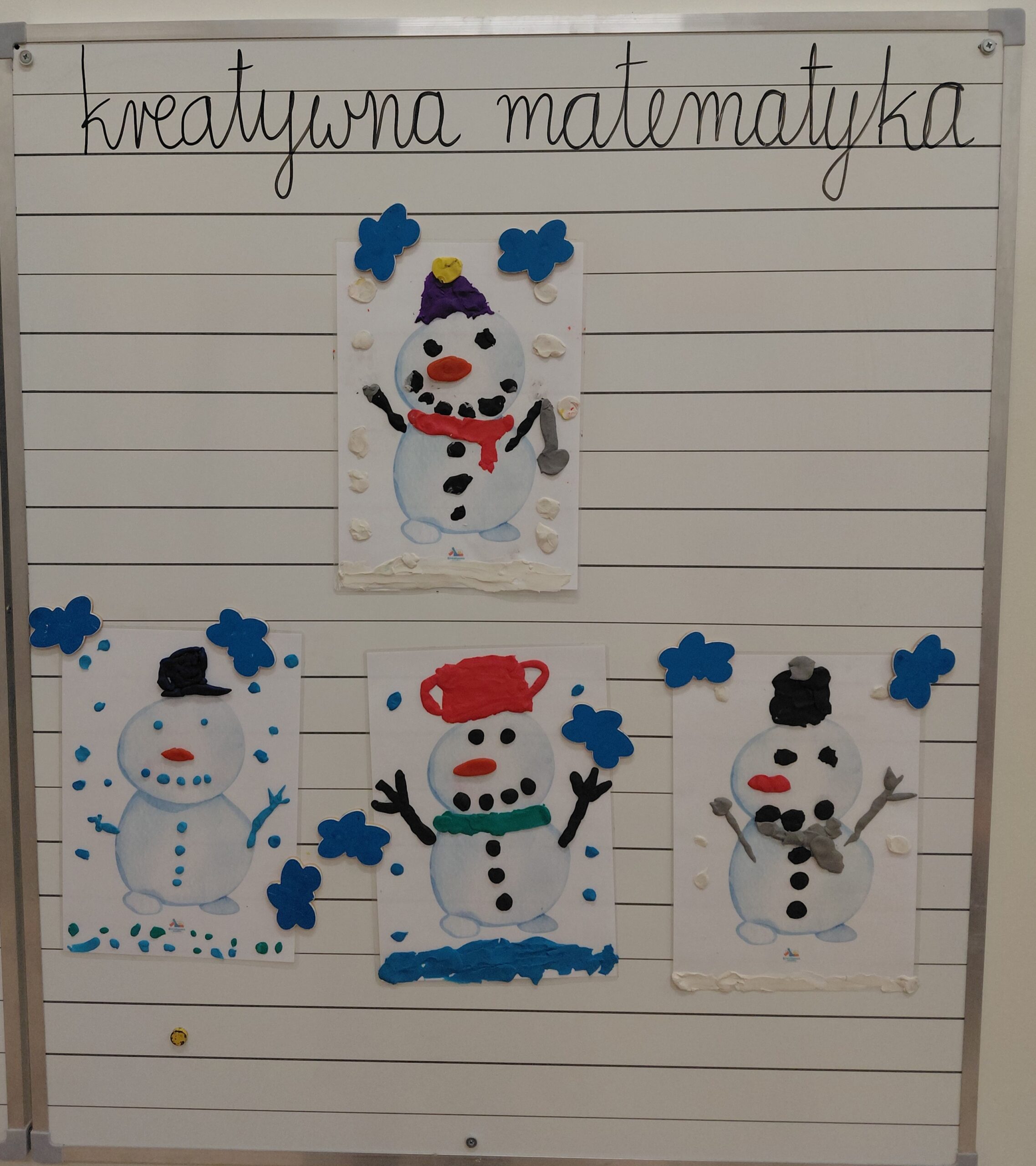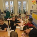 W tym samym czasie nasze sale opanowały bałwanki. Najmłodsi z klas pierwszych precyzyjnie wyklejali je z plasteliny, dbając o właściwą liczbę każdego elementu, natomiast trzecioklasiści wykazali się wiedzą geometryczną, konstruując postacie z figur według ścisłych instrukcji.