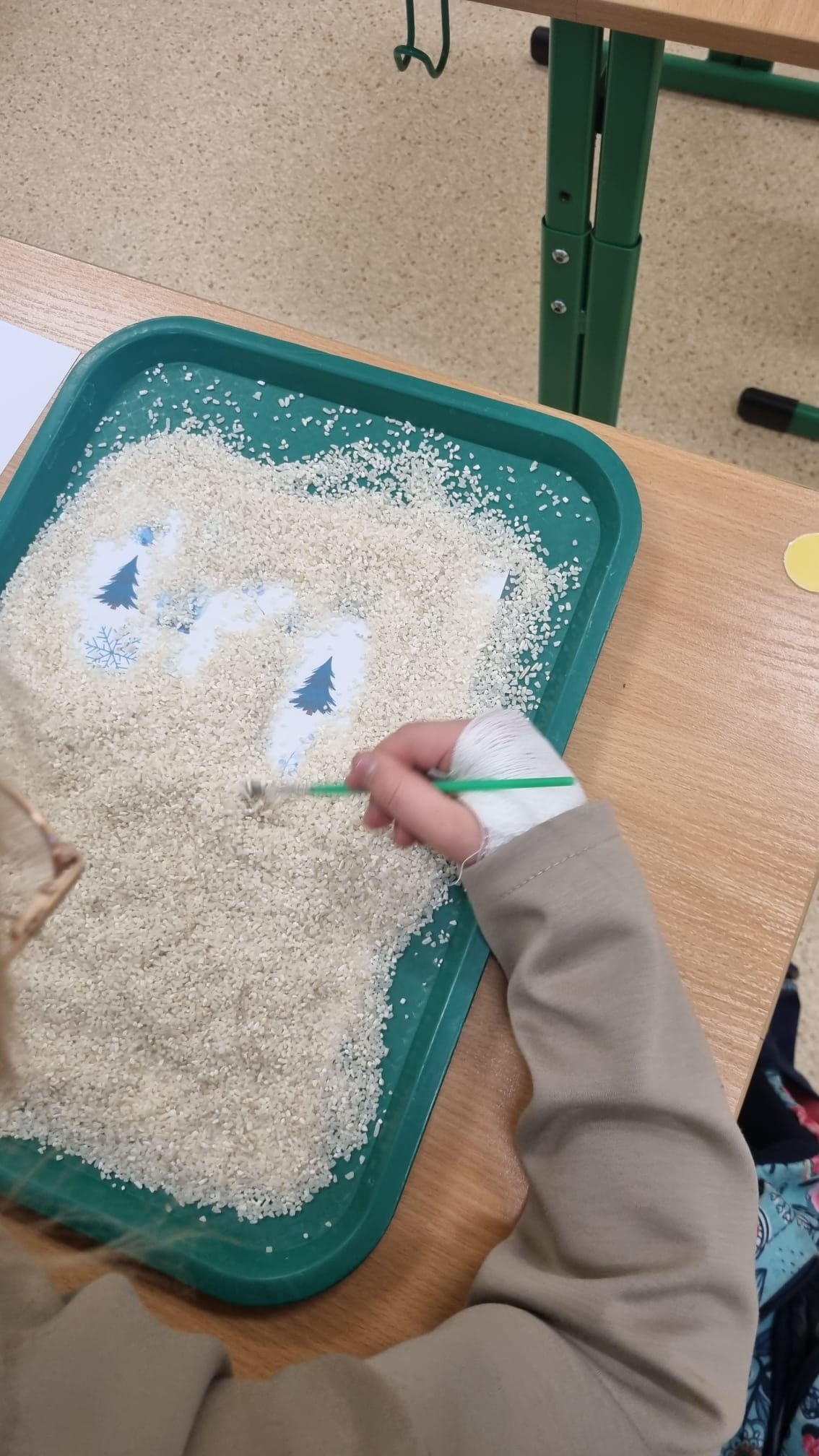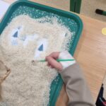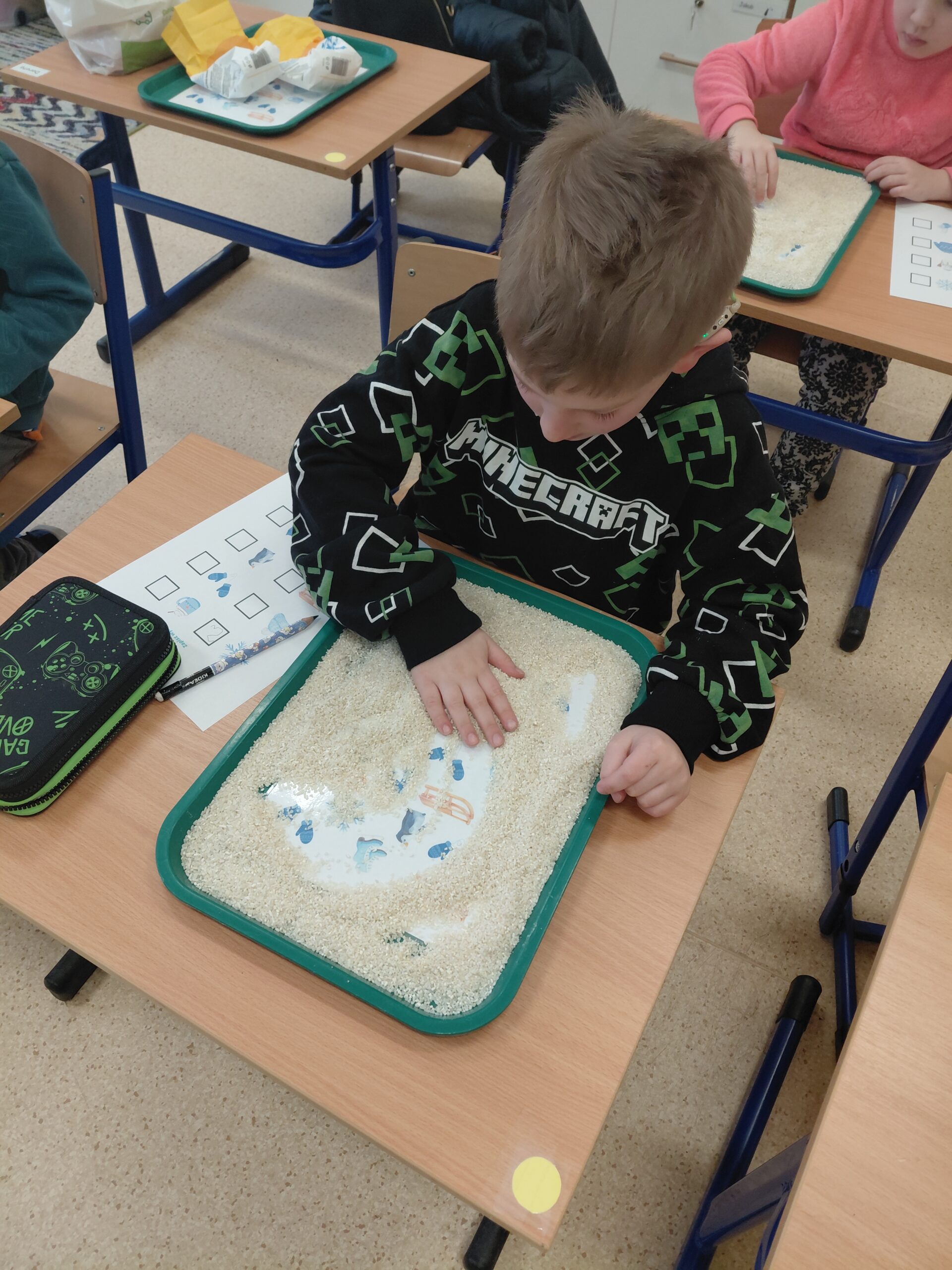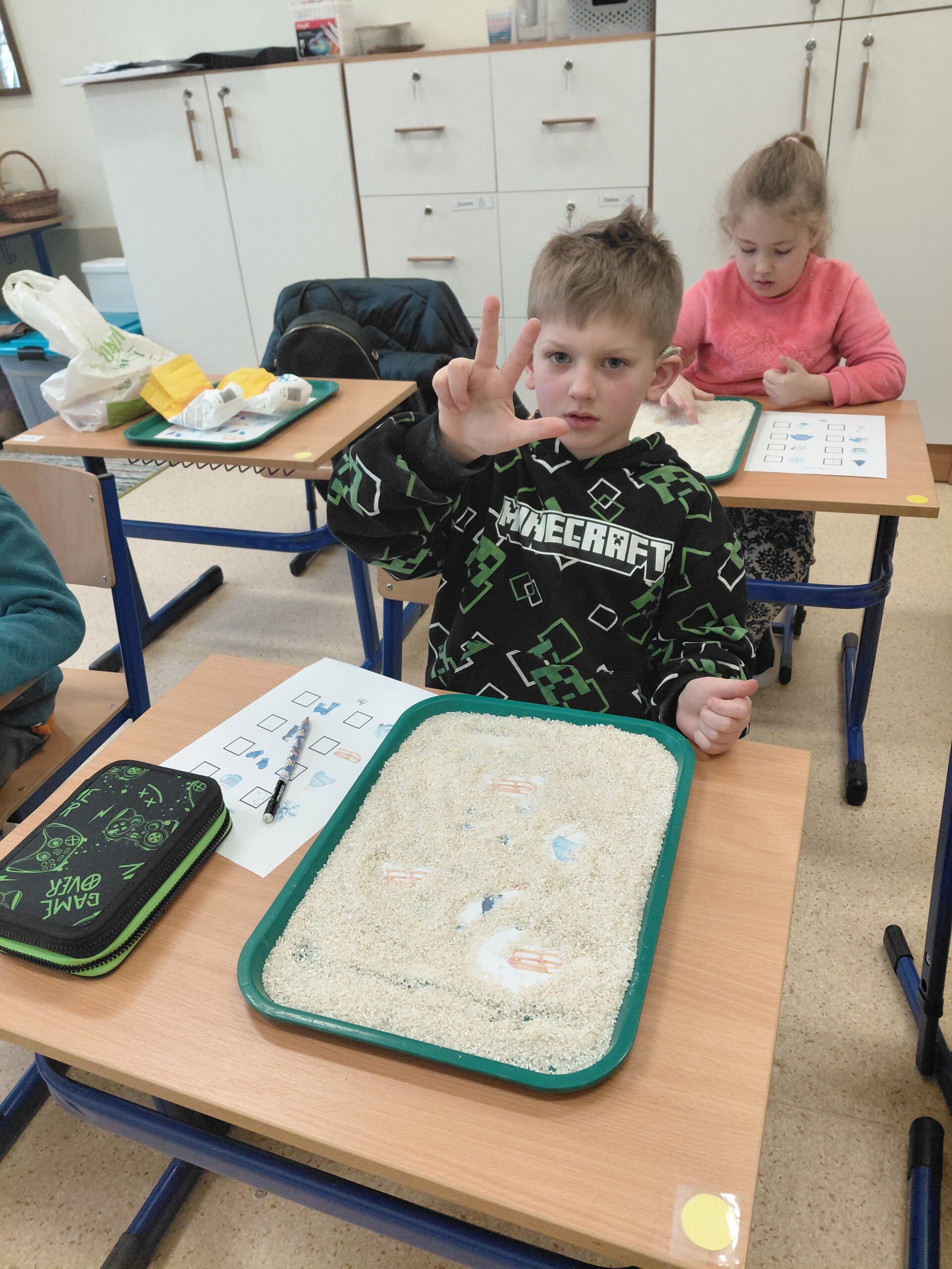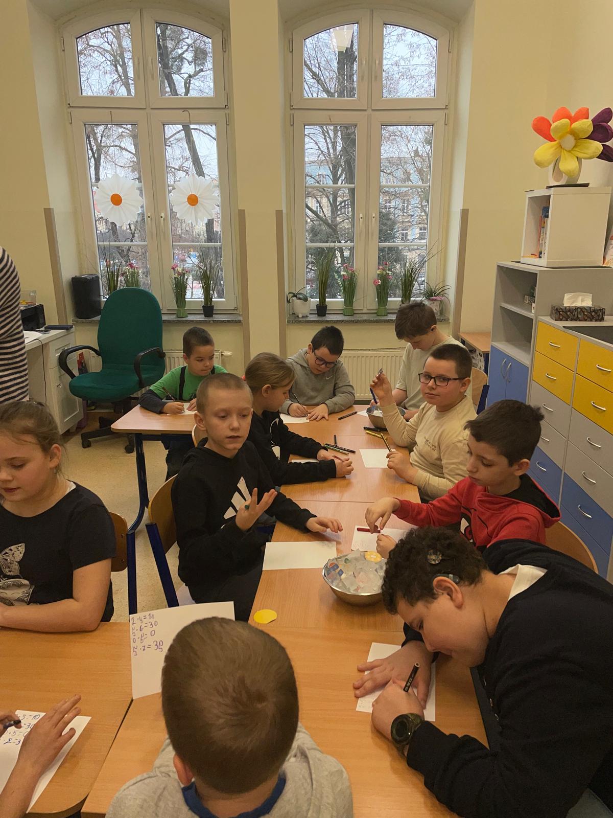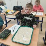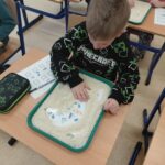 Zima przyniosła nam jeszcze więcej emocji i wyzwań sensorycznych! W pudełkach wypełnionych sypkimi materiałami uczniowie wytrwale tropili ukryte obrazki związane ze sportami zimowymi – każda odnaleziona łyżwa czy narta była pretekstem do sprawnego przeliczania znalezisk. Prawdziwym hitem okazała się jednak „mroźna matematyka” w klasach trzecich. Uczniowie zamienili się w badaczy, rozwiązując zadania na mnożenie i dzielenie, które… zostały uwięzione w kostkach lodu! Rozmrażanie wyników dostarczyło mnóstwo frajdy i pokazało, że nauka może być naprawdę orzeźwiająca.