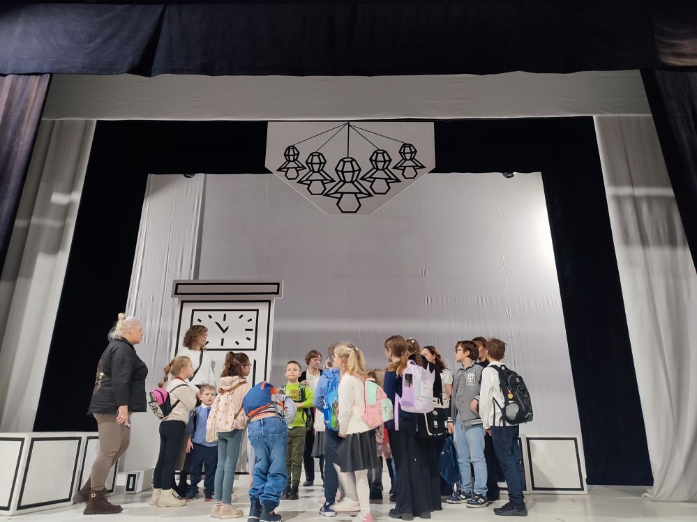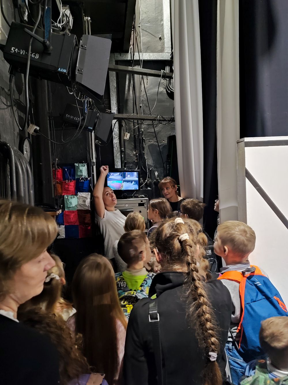 Co szczególnie ważne, przedstawienie było tłumaczone na Polski Język Migowy (PJM), dzięki czemu nasi uczniowie mogli w pełni uczestniczyć w odbiorze spektaklu i cieszyć się każdym jego elementem. Po zakończonym widowisku dzieci miały możliwość zwiedzenia zaplecza teatru – zobaczyły, jak wygląda scena od kulis, poznały tajniki pracy aktorów, oświetleniowców i scenografów. To była fascynująca lekcja, która pokazała, że teatr to nie tylko to, co widzimy z widowni, ale także ogromne zaplecze twórczej pracy wielu osób.
