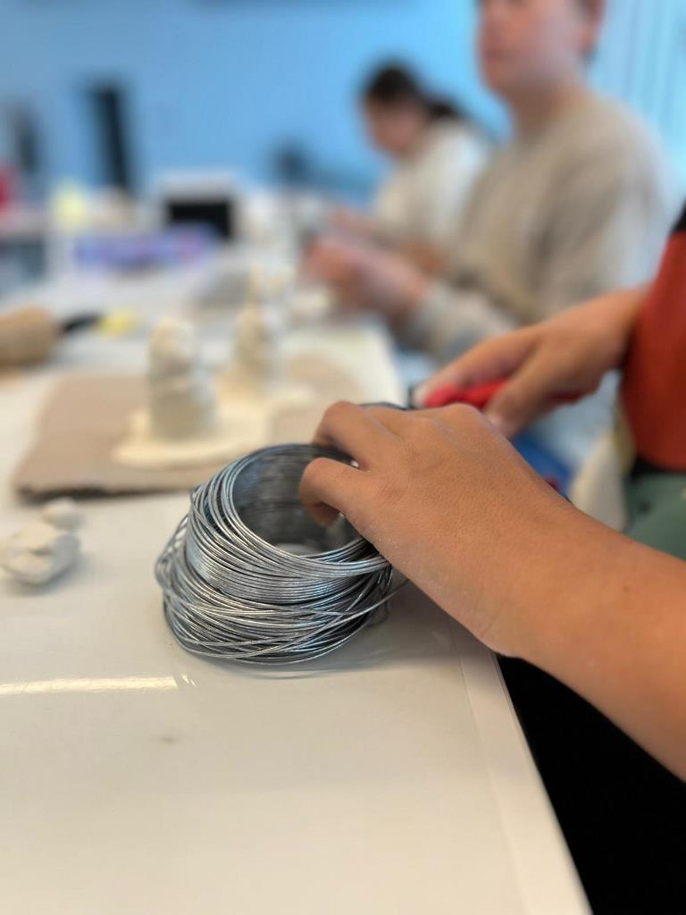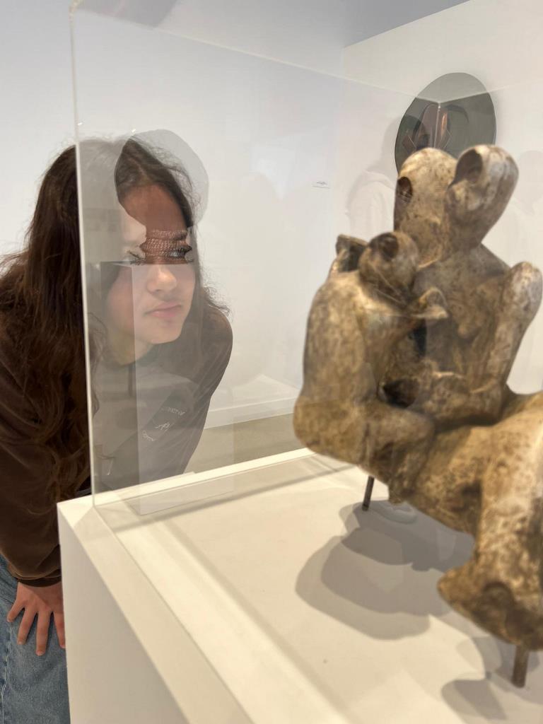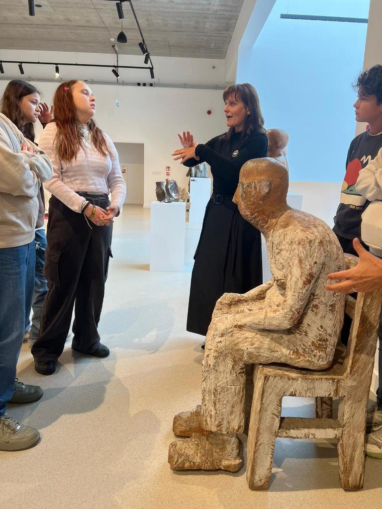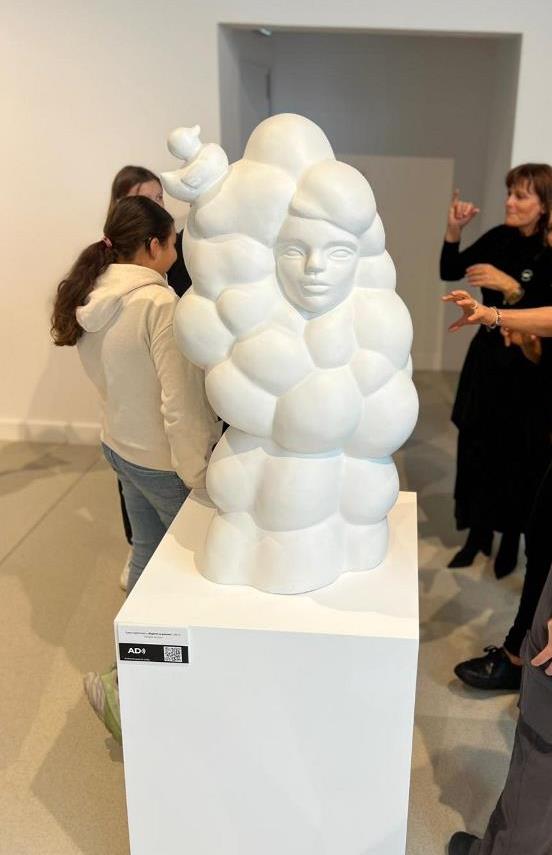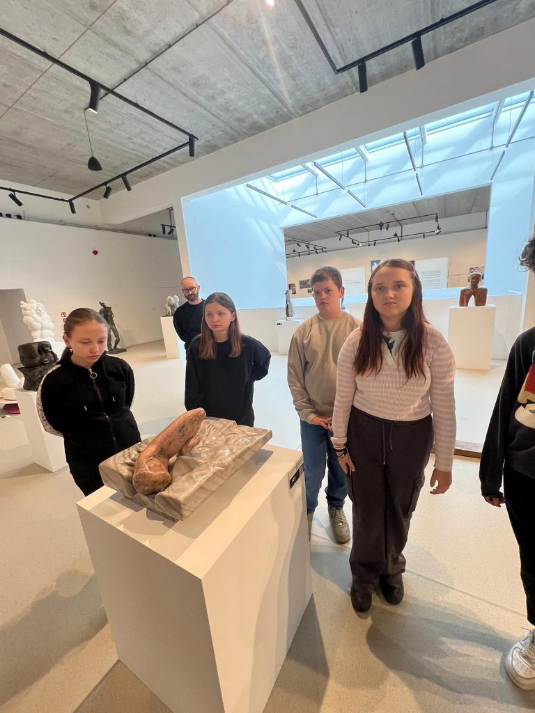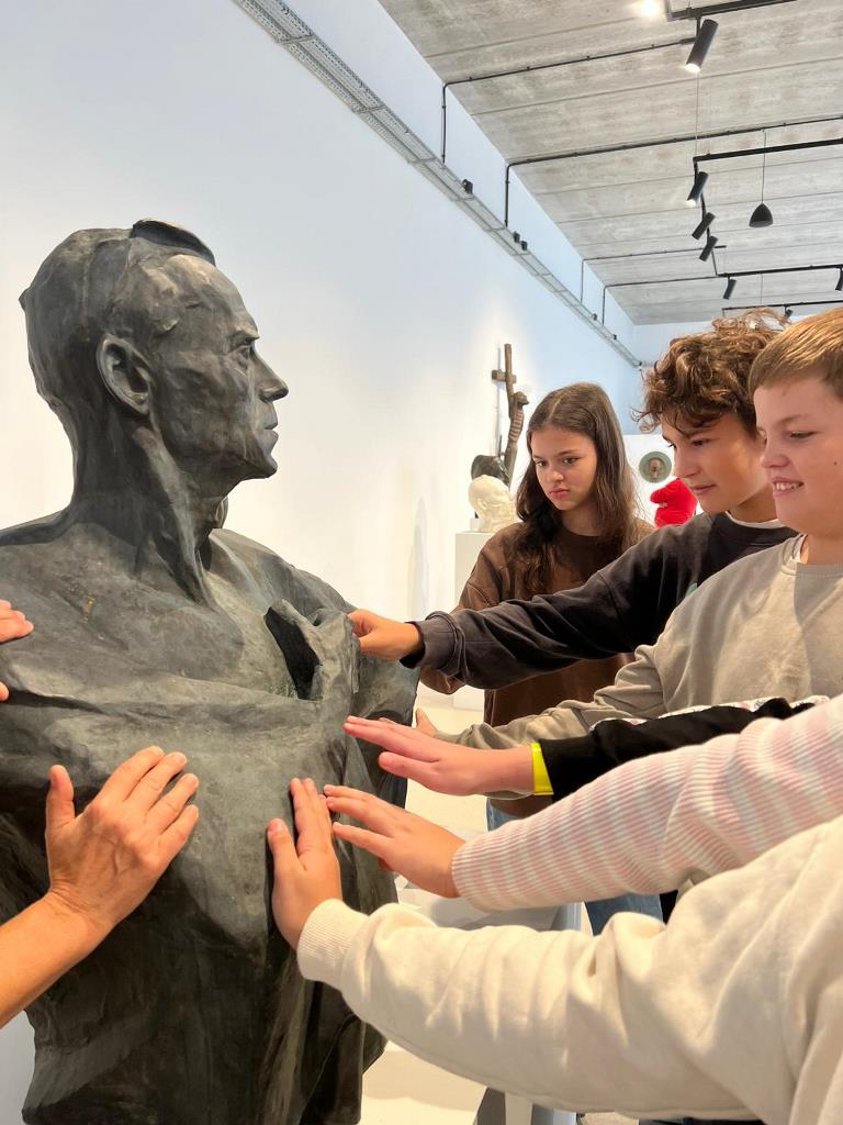 Już od pierwszych chwil uczestnicy zostali wciągnięci w niezwykłą atmosferę miejsca, w którym sztukę można było nie tylko oglądać, ale przede wszystkim – dotykać, słuchać, wąchać. Pani Jolanta zaprosiła młodzież do odkrywania świata rzeźby wszystkimi zmysłami. W przestrzeni wystawy czekały na nas różnorodne materiały: kamień, metal, ceramika i drewno – każdy o innym ciężarze, fakturze, zapachu i dźwięku. Dzieci z ogromnym zaciekawieniem podchodziły do eksponatów, mogły je dotknąć, poczuć pod palcami ich strukturę i temperaturę, posłuchać odgłosów, jakie wydają, kiedy się je porusza. Dla naszych uczniów – szczególnie tych z niepełnosprawnościami słuchu – było to doświadczenie wyjątkowe, pełne nowych bodźców i emocji. W warsztatach zapewniona była pełna dostępność komunikacyjna – obecny był tłumacz języka migowego PJM, dzięki czemu każdy mógł w pełni uczestniczyć w rozmowie i wymianie wrażeń.