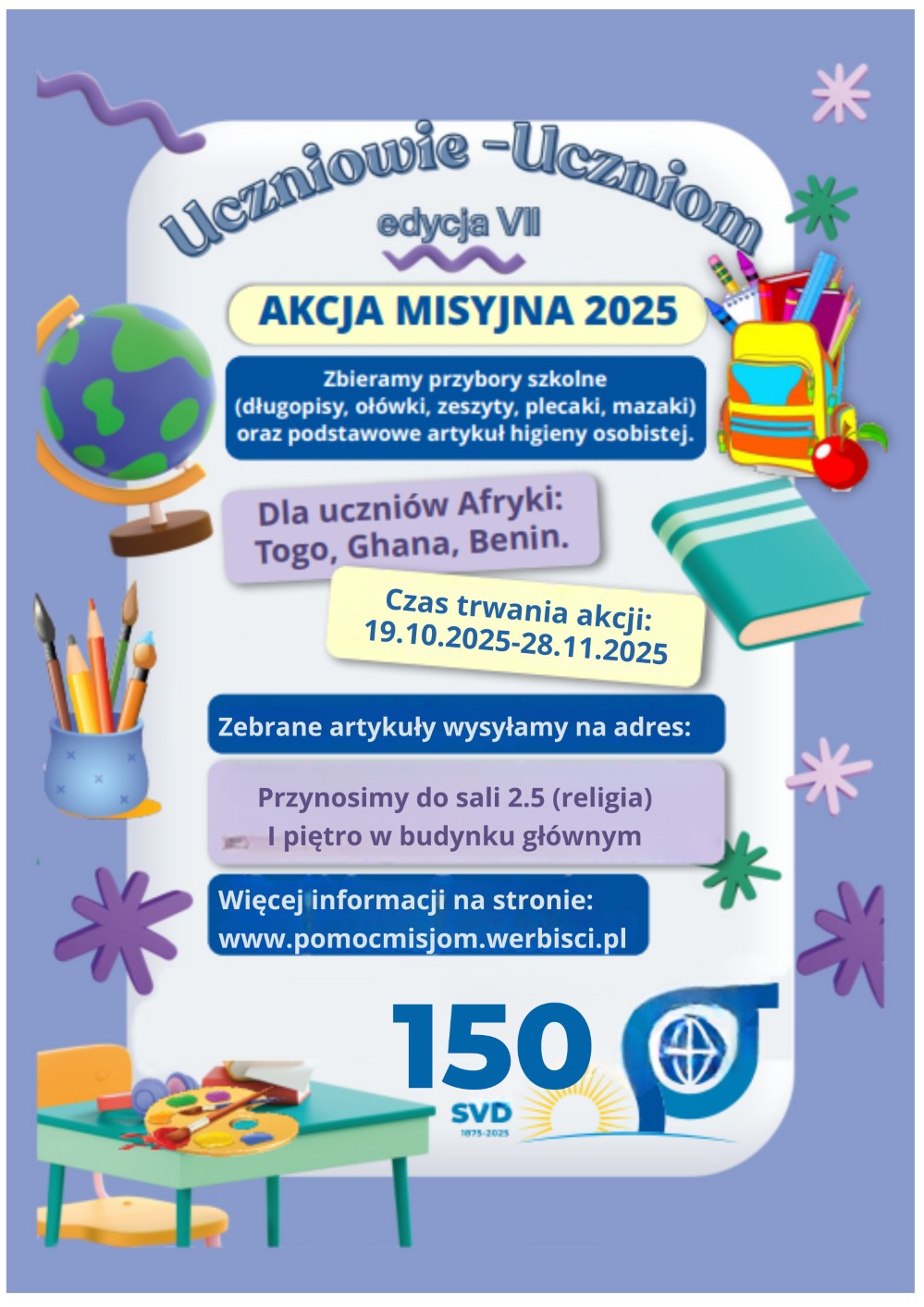 👉 Przybory można przynosić do sali 2.5 (I piętro w budynku głównym) do końca listopada. Szczegóły na plakacie.