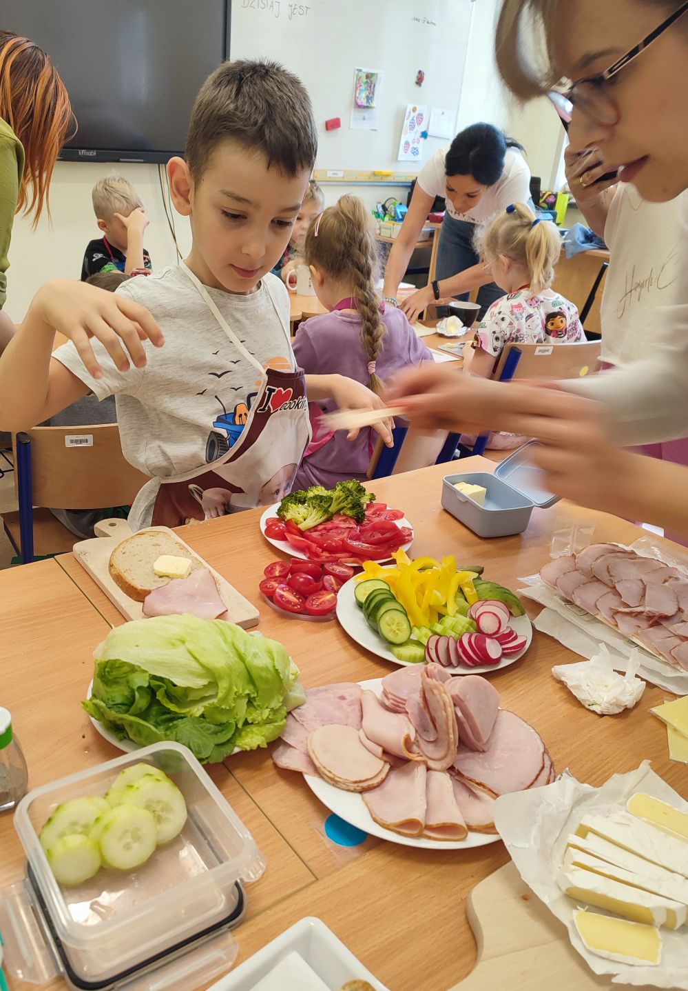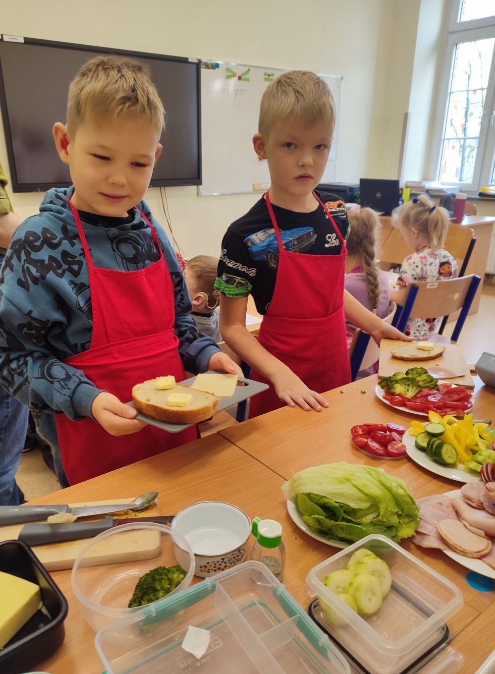 W środę, 5 listopada 2025 r., uczniowie klas 1b i 1c spotkali się wspólnie w jednej sali lekcyjnej, by przygotować zdrowe i kreatywne kanapki. Były pełnoziarniste pieczywo, świeże warzywa, owoce, sery i wędliny – wszystko to, co potrzebne, by stworzyć pyszne i kolorowe kanapki!